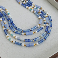 - Material: perla de agua dulce, acero de titanio, calcedonia azul, chapado en oro