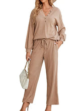 Prążkowany dzianinowy zestaw do domu: top i spodnie z detalem guzików | Khaki / S 100100421716103